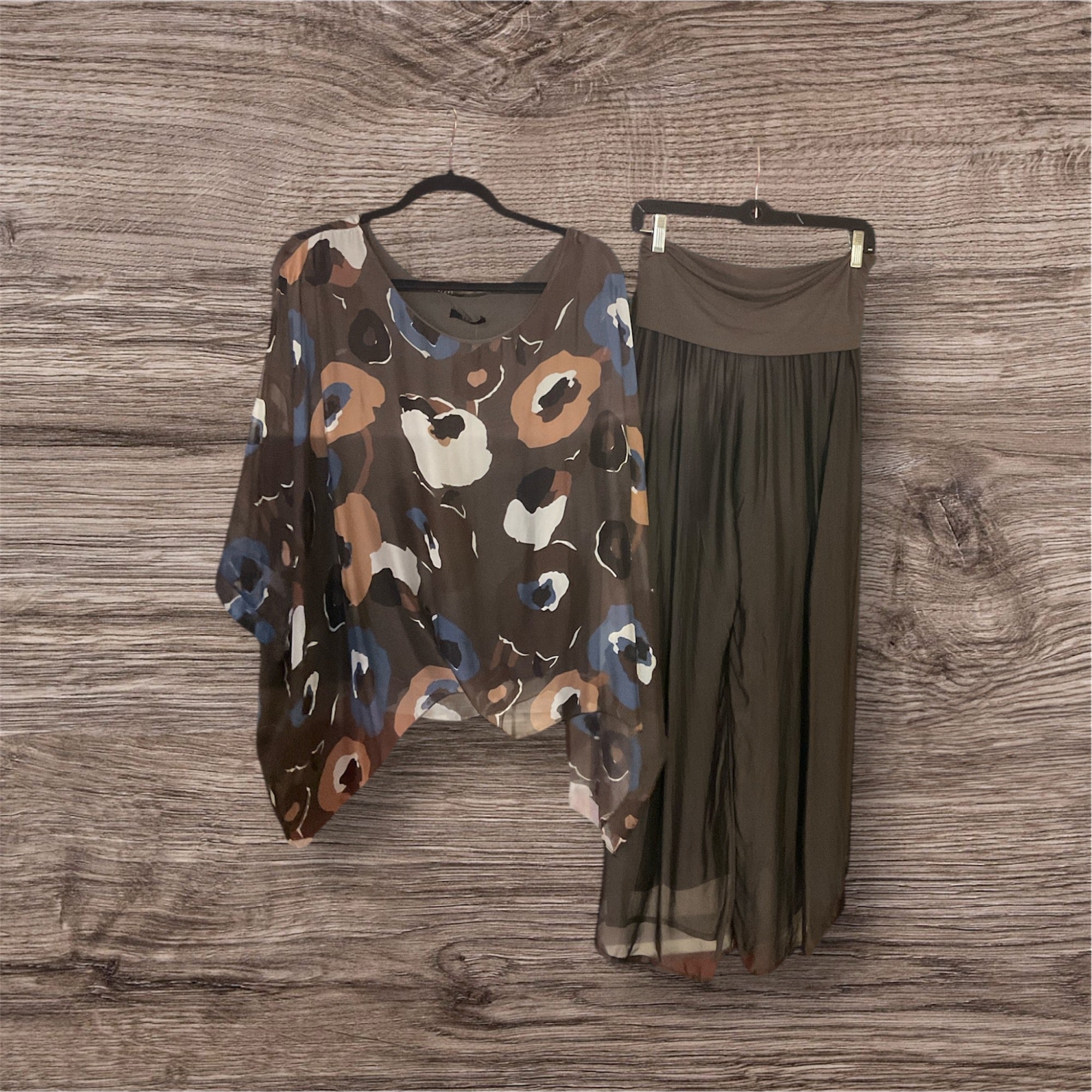 Achieve effortless elegance with the Silvia Satin Set. This stunning blouse and palazzo pants set is crafted from soft satin and features a beautiful autumn print. Perfect for any occasion, this set offers both comfort and style for a truly sophisticated look.